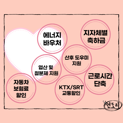 이 외에도 에너지 바우처, 엽산 및 철분제 지원, 자동차 보험료 할인, 지자체별 축하금, 산후 도우미 지원,