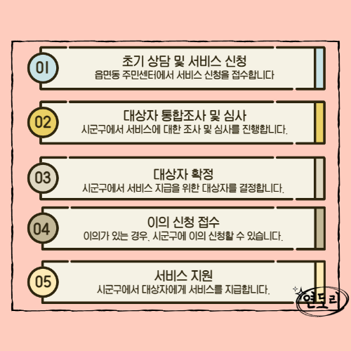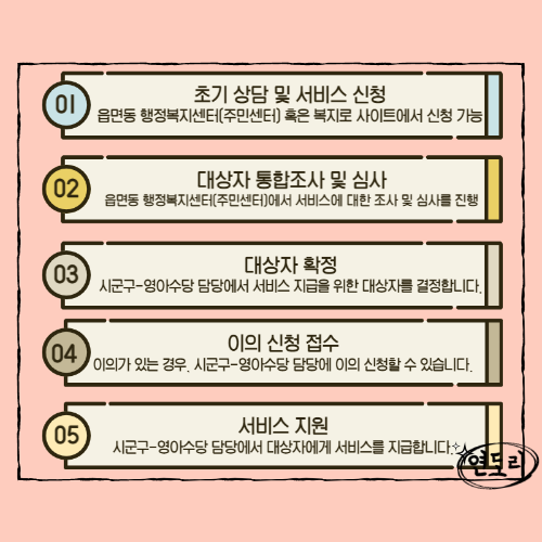- 읍면동 행정복지센터를 방문하거나 복지로 홈페이지 - 서비스 신청에서 온라인으로 신청할 수 있습니다.