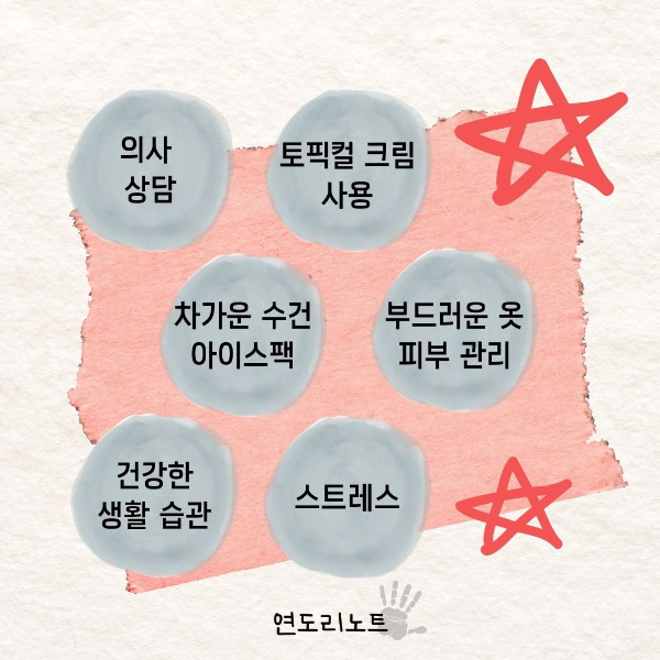 거친 옷감이나 타이트한 옷은 피하고, 통기성이 좋고 부드러운 옷을 선택하세요. 또한, 너무 자주 샤워하지 않고, 사용하는 비누는 순하고 피부에 자극이 없는 제품을 선택하는 것이 좋습니다.