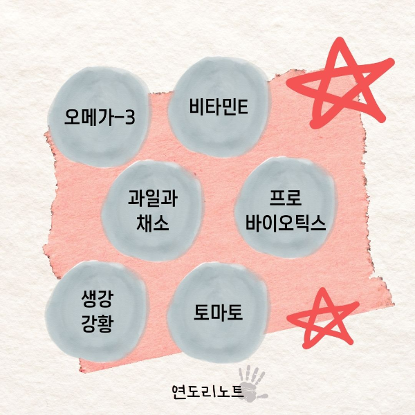 오메가-3 지방산이 풍부한 식품(예: 연어, 아마씨)과 비타민 E가 풍부한 식품(예: 견과류, 씨앗)을 섭취하면 피부 건강을 개선하는 데 도움이 됩니다.