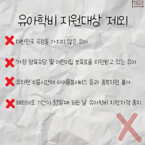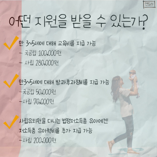 - 국공립 및 사립유치원에 다니는 3~5세 유아 지원 가능